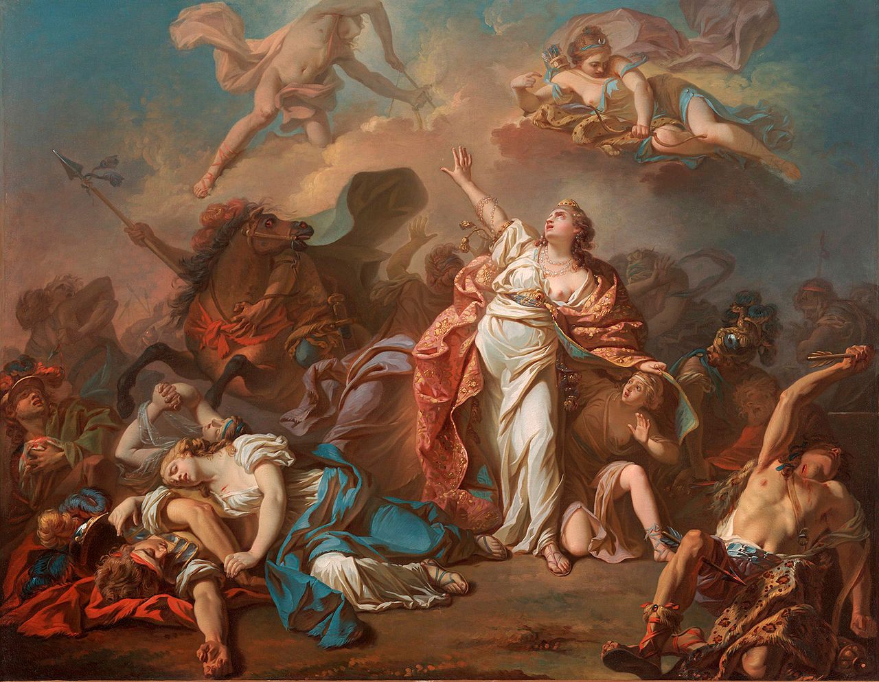 [Σ.σ.: Αφαιρώ την ερμηνεία «κίτρινο πέπλο» της νεοελληνικής απόδοσης και κρατώ το αρχαίο «κροκόπεπλος» διότι ως γνωστόν στην προχριστιανική αρχαία ελληνική γλώσσα δεν είχε σχηματισθεί ακόμα η έννοια του καθαρού κίτρινου χρώματος, το οποίο ως τέτοιο αναφέρεται από τον 1ο μ.Χ. αιώνα και ύστερα]